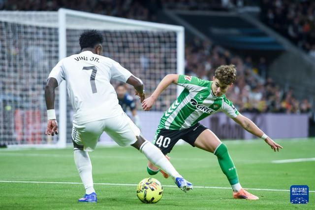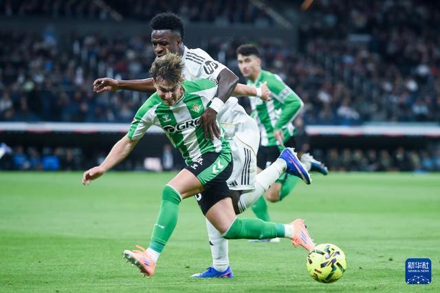 1月4日,皇家马德里队球员维尼修斯(左)和皇家贝蒂斯队球员安赫尔·奥尔帝斯拼抢。新华社发(古斯塔沃·巴连特摄)